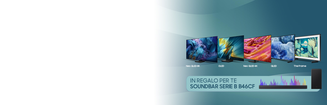 Acquista un TV in promozione su Samsung Online Shop o su Samsung Shop App dal 27 ottobre al 5 novembre 2025. Registrati entro 15 giorni dalla data di consegna del prodotto promozionato per ricevere la Soundbar B46CF entro 180 giorni dall'email di validazione.