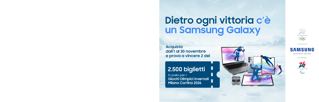 Acquista un prodotto Samsung Galaxy promozionato su un punto vendita aderente all’iniziativa dal 1 novembre 2025 al 30 novembre 2025. Registrati qui entro il 21 dicembre 2025 e parteciperai all’estrazione di 1.250 coppie di biglietti per i Giochi Olimpici Invernali Milano Cortina 2026