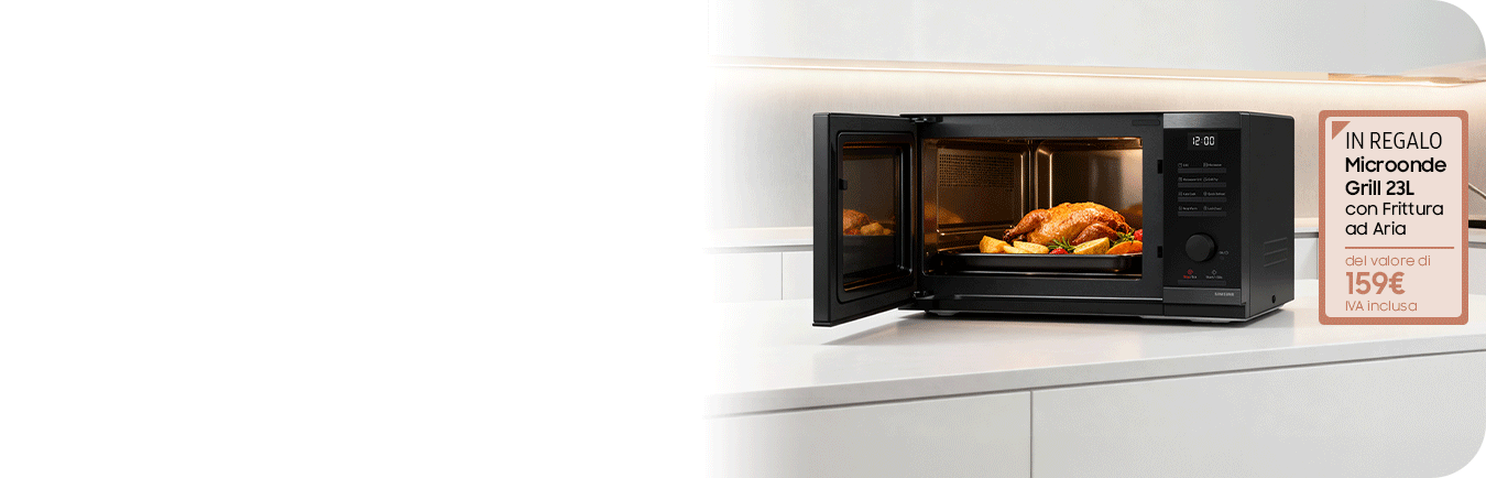 Acquista uno dei prodotti promozionati dal 4 dicembre 2025 al 26 gennaio 2026 inclusi. Registrati qui entro 20 giorni dalla data di consegna del prodotto promozionato e ricevi il microonde Grill Fry entro 180 giorni dall'email di validazione.