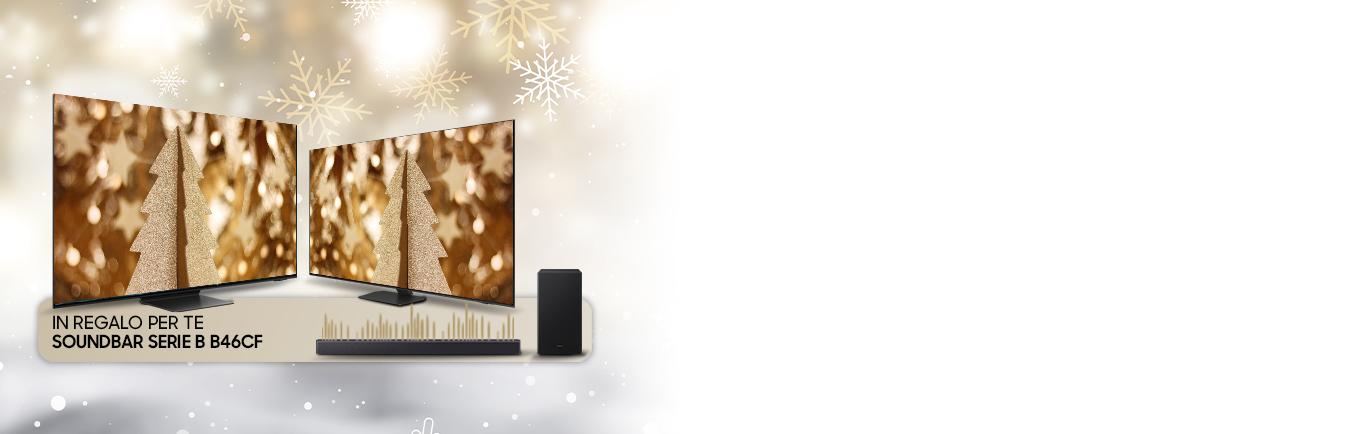 Acquista un TV in promozione dal 3 dicembre al 15 dicembre 2025 su Samsung Online Shop o su Samsung Shop App. Registrati qui entro 15 giorni dalla data di consegna del prodotto promozionato per ricevere la Soundbar Serie B B46CF entro 180 giorni dall’e-mail di validazione.