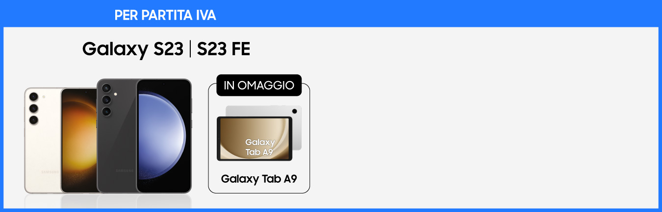 Acquista con p.iva Galaxy S23 e S23 FE su Samsung Business Shop e presso il Samsung Experience Store dal 19 agosto all'8 settembre 2024 inclusi. Registrati qui entro il 7 novembre 2024 per ricevere Galaxy Tab A9 entro 180 giorni dalla data dell'email di validazione.