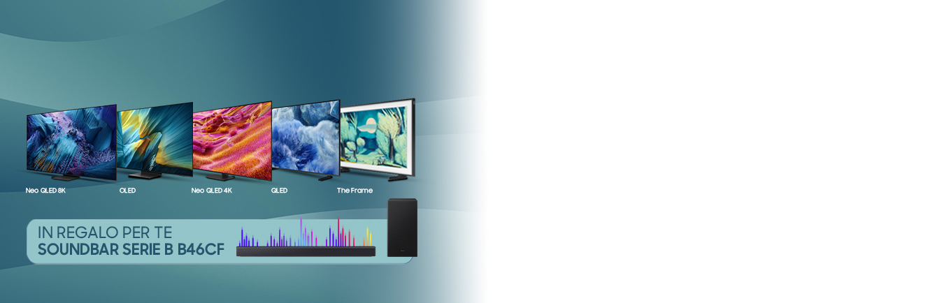Acquista un TV in promozione su Samsung Online Shop o su Samsung Shop App dal 27 ottobre al 5 novembre 2025. Registrati entro 15 giorni dalla data di consegna del prodotto promozionato per ricevere la Soundbar B46CF entro 180 giorni dall'email di validazione.